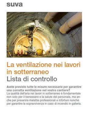 Per verificare che la ventilazione del vostro cantiere sotterraneo sia in buono stato e funzioni in modo affidabile, può essere utile fare riferimento alla lista di controllo “La ventilazione nei lavori in sotterraneo. Lista di controllo” prodotta dall’Istituto Suva (istituto svizzero per l'assicurazione e la prevenzione degli infortuni) e contenente 29 domande su temi come progettazione del sistema di ventilazione, struttura del sistema di ventilazione, funzionamento della ventilazione, formazione/organizzazione e monitoraggio della ventilazione.