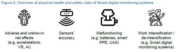 Ad esempio si ricorda che i sistemi di monitoraggio digitale intelligenti possono avere effetti negativi o comunque sconosciuti sulla sicurezza e sulla salute dei lavoratori. Ad esempio, gli esoscheletri, ridistribuendo lo sforzo nel corpo, possono generare nuovi fattori di rischio che possono portare a disturbi muscolo-scheletrici (DMS) e possono comportare altri rischi, come l'aumento del carico cardiovascolare e dello stress o possono favorire un'eccessiva fiducia dei lavoratori nelle proprie capacità che può portare ad incidenti.