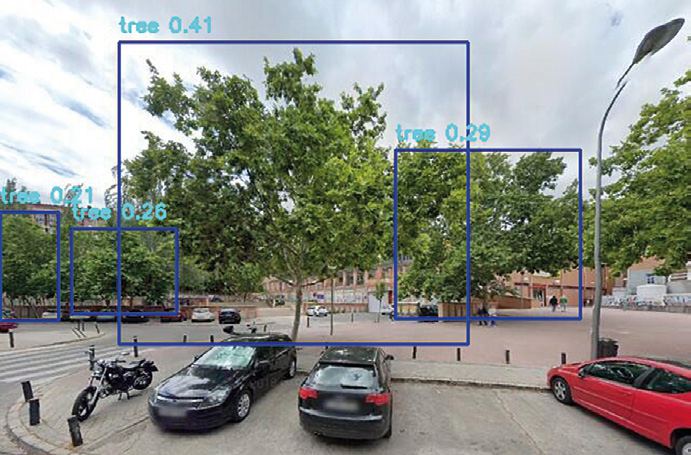 Gli algoritmi utilizzati permettono un’identificazione automatica degli alberi presenti nell’immagine. I riquadri blu rappresentano i limiti spaziali identificati dall’algoritmo, mentre le scritte azzurre riportano l’oggetto identificato (in questo caso alberi) e la probabilità espressa in decimali che questi oggetti siano effettivamente quelli richiesti in fase di definizione dell’algoritmo.