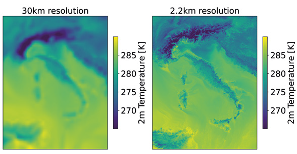 Previsioni meteorologiche per lo stesso istante temporale per la temperature a 2 m da suolo (variabile standard delle analisi meteorologiche ed espressa in gradi Kelvin) ottenute con un modello globale la cui risoluzione è 30 km per ogni pixel a sinistra e la stessa grandezza ottenuta con il modello Cosmo la cui risoluzione spaziale è 2,2 km a destra..