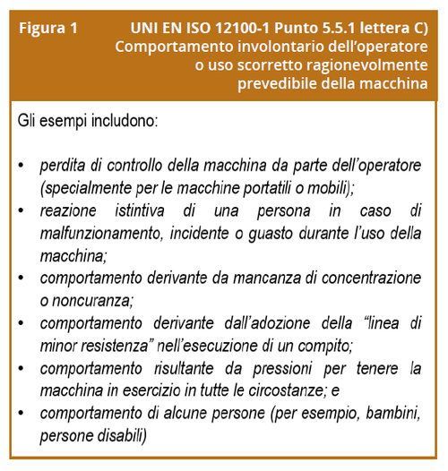 La scheda si sofferma anche sulla norma UNI EN ISO 12100 che “fornisce un elenco esemplificativo di comportamento involontario dell’operatore o uso scorretto ragionevolmente prevedibile della macchina”.