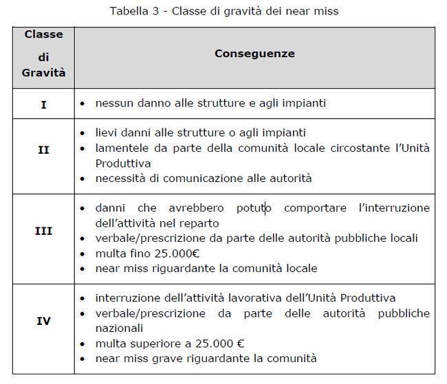 Nel documento è presenta una tabella, che riprendiamo integralmente, con la classe di gravità dei near miss: