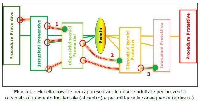 Nella figura, che illustra graficamente la bow-tie, “al centro è rappresentato l’evento incidentale, a sinistra le barriere di prevenzione, a destra quelle di mitigazione delle conseguenze (protezione). Le barriere tecniche di prevenzione e protezione sono quelle più vicine all’evento, cioè sono, rispettivamente, le ultime che possono evitare l’accadimento di un incidente e le prime che intervengono per contenere le conseguenze”.