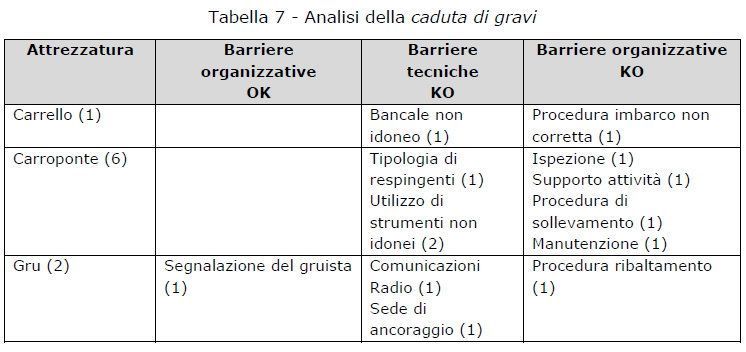 Gli esempi raccolti nella tabella evidenziano che “lo svolgimento non corretto delle procedure di imbarco, sollevamento o ribaltamento, hanno causato gli eventi incidentali. Anche la carenza di manutenzione o di supporto alle attività di movimentazione hanno contribuito negativamente agli eventi accaduti”.