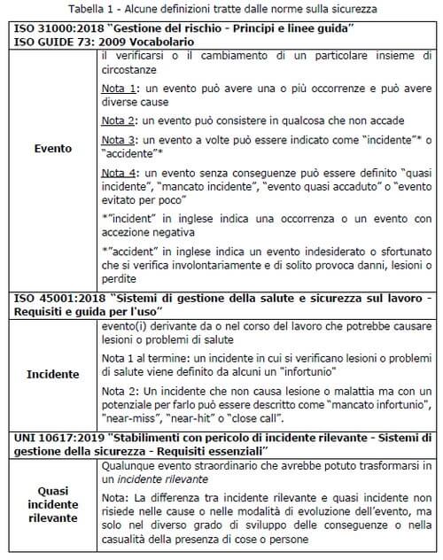 - la norma UNI 10617:2019 "Stabilimenti con pericolo di incidente rilevante - Sistemi di gestione della sicurezza - Requisiti essenziali” - per quanto concerne le aziende, prevalentemente del polo chimico e petrolchimico e che “ricadono sotto la direttiva Seveso oggi al terzo aggiornamento con il d.lgs. 105/15”. La norma “fornisce i requisiti per la realizzazione e la gestione di un Sistema di Gestione della Sicurezza finalizzato alla prevenzione degli incidenti rilevanti connessi con l'utilizzo di sostanze pericolose”. Il report indica che in questa ultima versione “la raccolta dei quasi incidenti o accaduti nell’azienda stessa o registrati in aziende simili, è obbligo di legge e va fatto compilando la modulistica, inserita in allegato al decreto, relativa all’esperienza operativa dell’azienda, tale documento in sede ispettiva viene verificato attraverso una apposita lista di riscontro”.