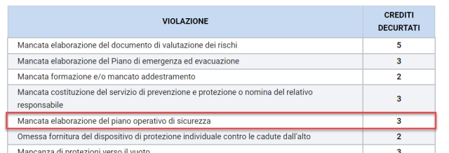 Con l’avvento di questo nuovo sistema di qualificazione di imprese e lavoratori, il Piano Operativo di Sicurezza (POS) assume un ruolo ancora più rilevante per la gestione della sicurezza nei cantieri e la relativa omessa elaborazione comporta la decurtazione di 3 crediti, da quelli disponibili sulla patente, come previsto dell’Allegato I-bis (Fattispecie di violazioni che comportano la decurtazione dei crediti dalla patente di cui all'articolo 27) del D.Lgs. 81/2008.