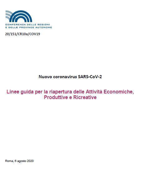 Il 6 agosto 2020 la Conferenza delle Regioni ha approvato la nuova versione (20/151/CR10a/COV19) del documento “Nuovo coronavirus SARS-CoV-2. Linee guida per la riapertura delle Attività Economiche, Produttive e Ricreative”.