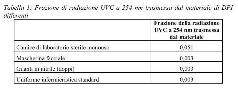 - camici: “i camici medici possono essere fatti di diversi materiali in base alla loro riutilizzabilità. I camici riutilizzabili sono in cotone mentre quelli monouso sono generalmente in materiale plastico (propilene o polipropilene). Anche se l'uso di UV per la disinfezione di camici in cotone potrebbe essere efficace e non portare a un deterioramento apprezzabile delle fibre [Perincek et al., 2014], il loro trattamento disinfettante d'elezione rimane quello con acqua calda, sapone e disinfettanti, ad esempio a base di cloro [WHO, 2020]. Inoltre, come nel caso delle mascherine, non è sicuro che gli UV sarebbero in grado di eliminare tutti i patogeni dai camici, a causa delle zone in ombra create dalle pieghe del tessuto. Il pretrattamento con UV prima della svestizione resta comunque un'ipotesi da considerare soprattutto nelle situazioni di elevata contaminazione biologica quale quella che si può riscontrare nei reparti di malattie infettive per abbattere significativamente l'eventuale carica virale e batteriologica”.