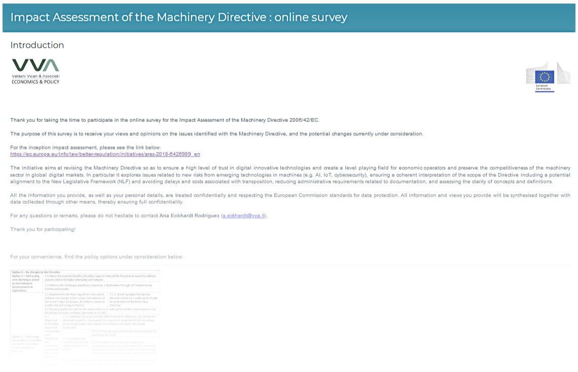 Questo, per avere ulteriori informazioni su interviste e questionari, è il link relativo al sondaggio online per la valutazione d’impatto della direttiva macchine, ne riprendiamo uno strlacio:
