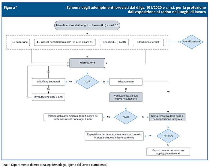 Riprendiamo dal documento una figura con lo schema degli adempimenti previsti dal d.lgs. 101/2020 e s.m.i. per la protezione dall’esposizione al radon nei luoghi di lavoro: