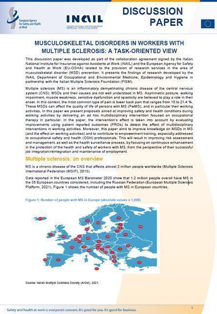Agenzia europea per la sicurezza e la salute sul lavoro, “ Musculoskeletal disorders in workers with multiple sclerosis: a task-oriented view”, discussion paper in lingua inglese, a cura di Benedetta Persechino, Giuliana Buresti, Sergio Iavicoli (Inail), Mario A. Battaglia, Paolo Bandiera, Giampaolo Brichetto, Grazia Rocca, Tommaso Manacorda (FISM), documento correlato alla campagna europea “Ambienti di lavoro sani e sicuri. Alleggeriamo il carico!” (formato PDF, 980 kB).