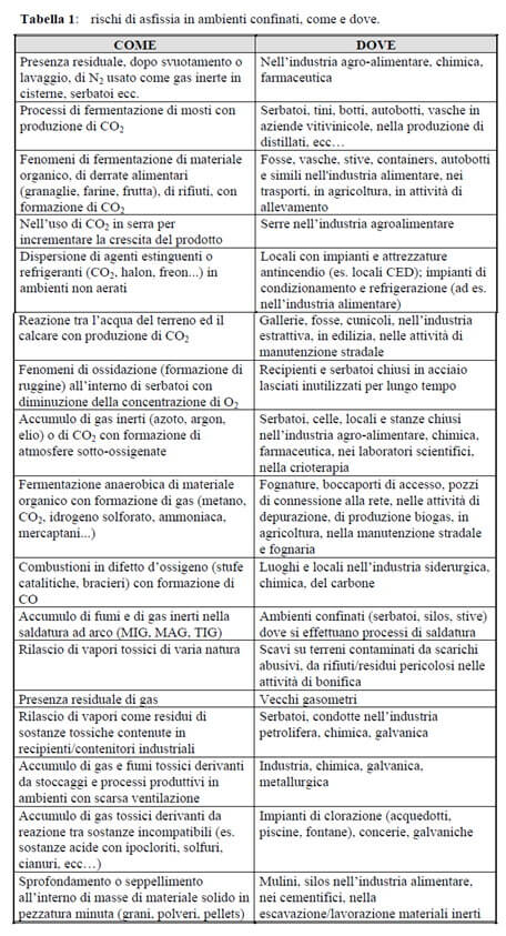 Riportiamo dal documento una tabella che segnala quelle attività/situazioni in cui si possono presentare i rischi di asfissia: