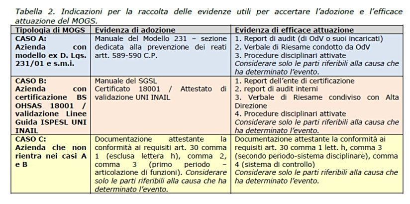 Si indica che il MOGS “può essere stato formalizzato dall’Azienda (come Modello ex D. Lgs. 231/01 oppure SGSL certificato BS OHSAS 18001 o con validazione di parte terza ex Linee Guida ISPESL UNI INAIL), oppure non risultare formalizzato e quindi andrà desunto dallo SPISAL sulla base degli atti predisposti dall’azienda al fine di adempiere ai diversi obblighi normativi”. Una tabella nel documento riporta le indicazioni per la raccolta delle evidenze utili per accertare l’adozione e l’efficace attuazione del MOGS.