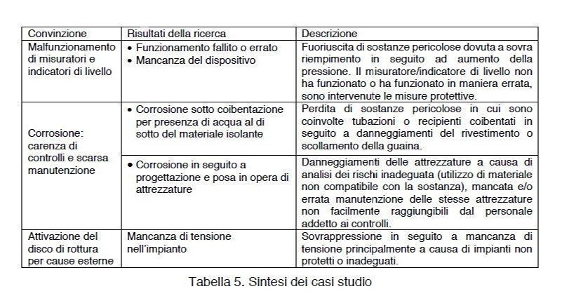Un esempio è il caso del “funzionamento dei misuratori/indicatori di livello (in un caso addirittura assenti, se pur in un solo caso da contestualizzare comunque alla ricerca effettuata), della carenza dei controlli e della scarsa manutenzione delle attrezzature. Questo aspetto, critico e ben noto agli ispettori Seveso coinvolti nelle attività di controllo del SGSPIR, è stato confermato dai risultati della ricerca effettuata a più ampio spettro su documenti specifici relativi ai near miss. Pertanto, questo argomento deve essere ulteriormente approfondito non soltanto nel corso delle ispezioni, ma anche attraverso strumenti diversi che mirino ad aumentare la consapevolezza dei gestori in tutte le fasi di gestione dell’impianto”.