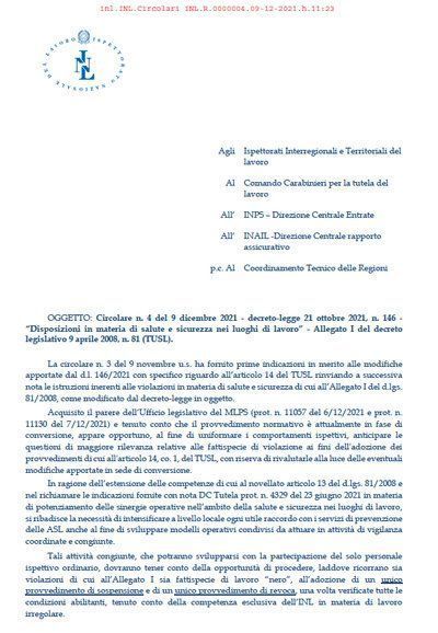 La nuova circolare n. 4/2021 ha per oggetto: “decreto-legge 21 ottobre 2021, n. 146 – ‘Disposizioni in materia di salute e sicurezza nei luoghi di lavoro’ - Allegato I del decreto legislativo 9 aprile 2008, n. 81 (TUSL)”.