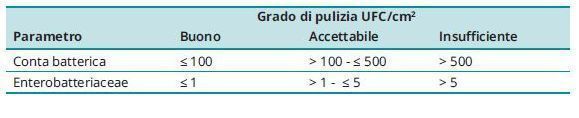 - superfici/piani di lavoro destinati a particolari utilizzi: in alcune tipologie di ambienti indagati (ad esempio centri estetici, spa, alberghi), nel corso delle ispezioni può rendersi necessario valutare anche l’efficacia delle procedure di sanificazione adottate dal personale. In questo caso oltre a CBT e CM possono essere ricercati anche altri parametri quali stafilococchi, Pseudomonadaceae, Enterobatteriacee”. Si indica inoltre che il campionamento “viene effettuato (con o senza delimitatore a seconda della tipologia di superficie) prima e dopo le operazioni di sanificazione e al termine delle analisi viene calcolato il tasso di abbattimento, dato dal rapporto fra la concentrazione del parametro dopo la sanificazione e dello stesso prima della sanificazione. Sulla base dei dati storici si considerano accettabili tassi di abbattimento ≤ 0,1 UFC/cm2 (conta microbica in relazione alle unità formanti colonie, ndr) per CBT e ≤ 0,3 UFC/cm2 per CM”.